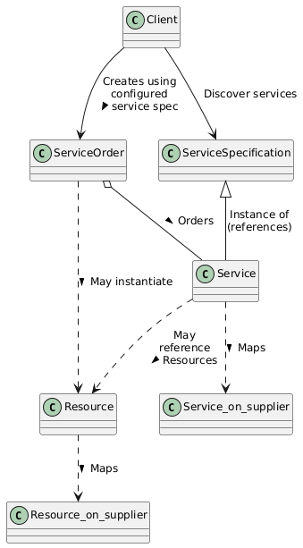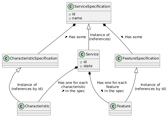 Services are defined through Service Specifications which define their characteristics, features and also their category.